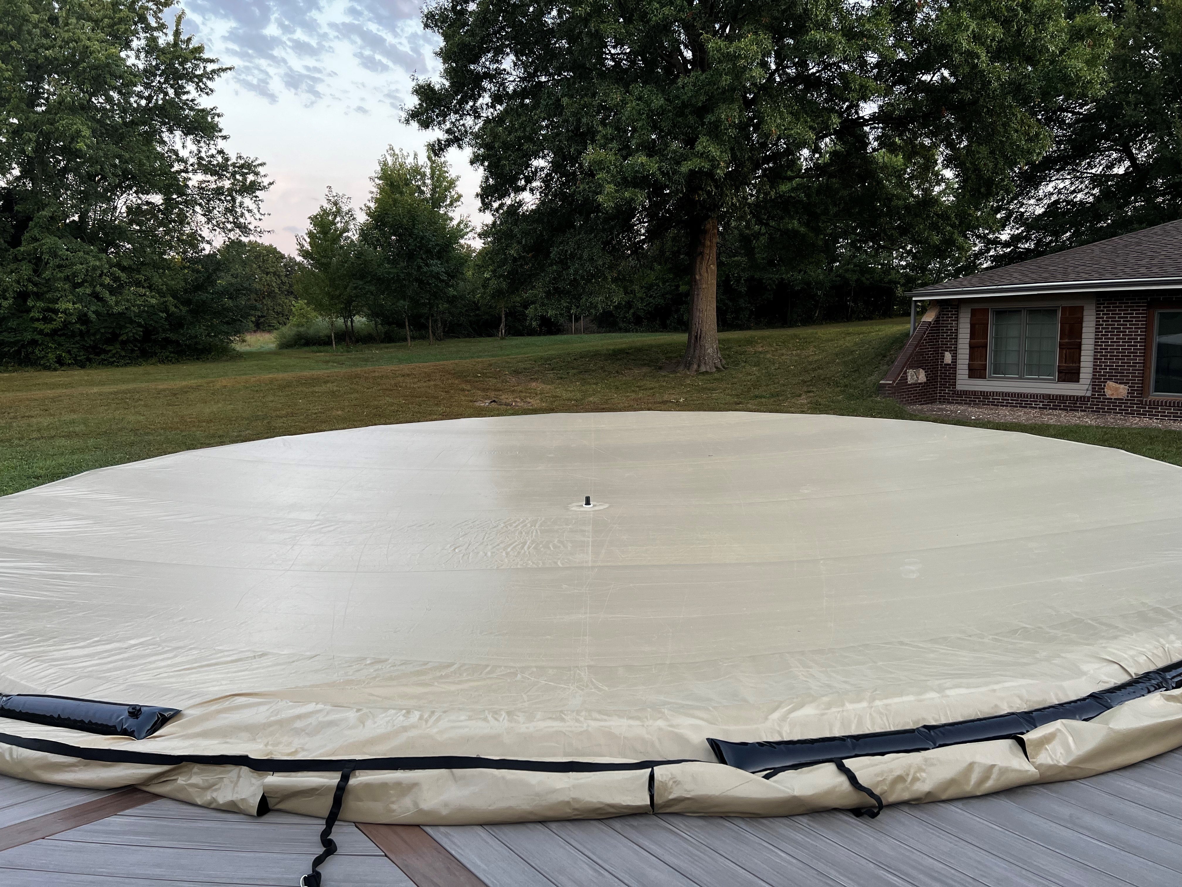 These covers offer the most complete and maintenance free protection of any other cover. Patented Design. These are the only covers to offer a 50MPH wind Guarantee. These covers can be customized to fit on above ground pools with no decks, partial decks or full decks. They come with sand tube and a center drain that allows any rain water to simple go down the drain. No more cover pumps or siphon hoses ever again to worry about. Protects your investment and provides a safer environment than standard tarps.
